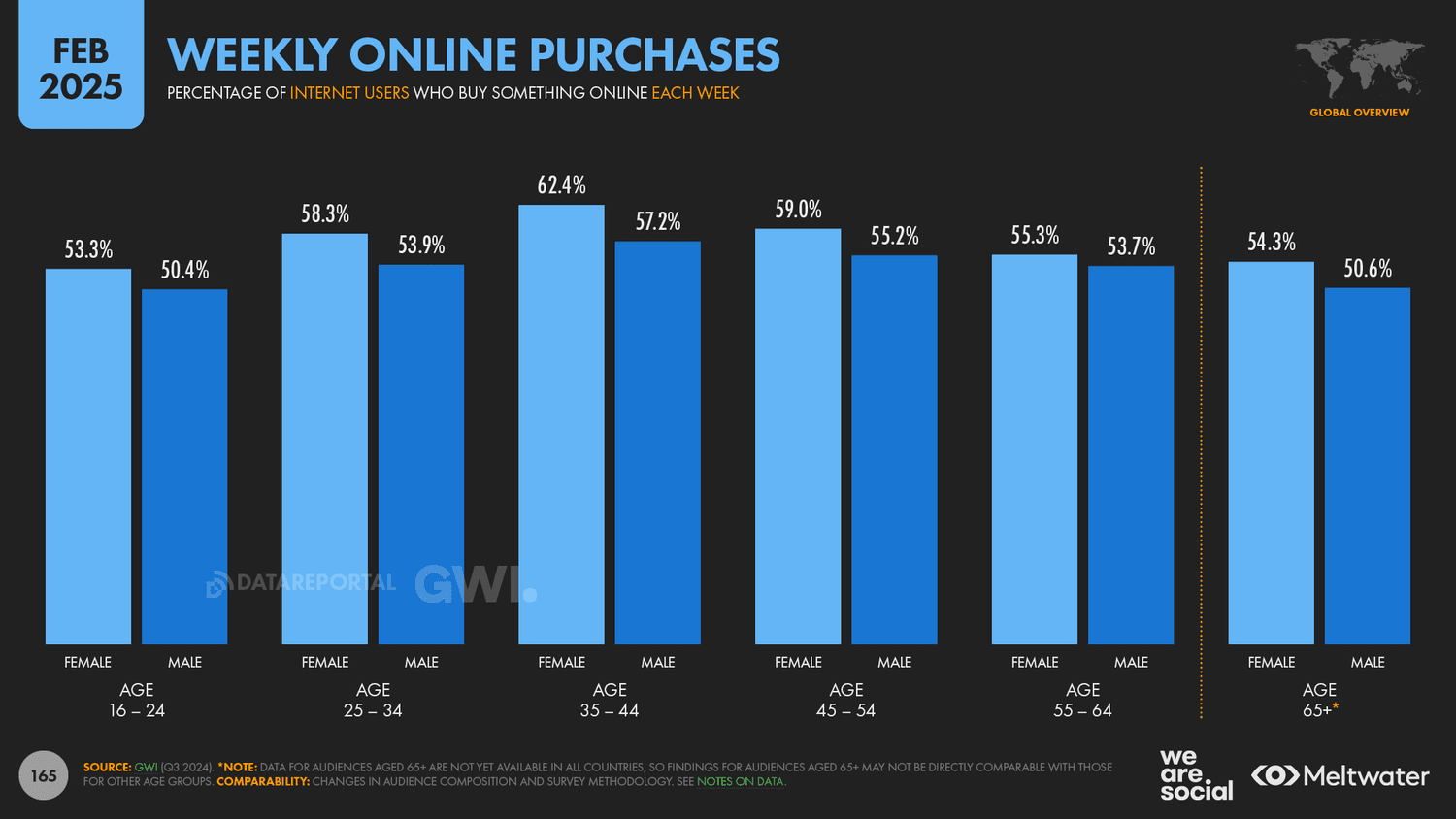 And in fact, while the geographic coverage of GWI’s survey for audiences aged 65 and above isn’t quite as extensive as the rest of its survey, the available data suggest that retirees are actually more likely than people aged 16 to 24 to make online purchases each week.