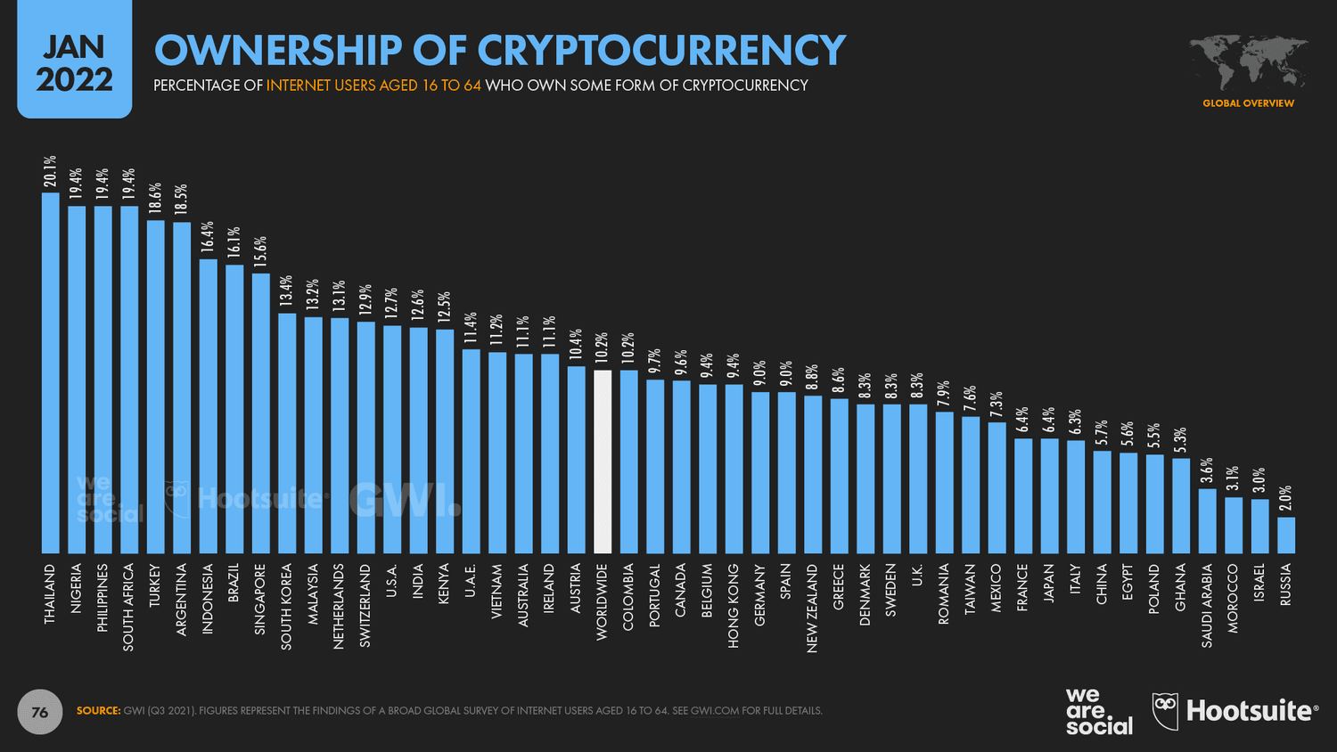 More than 1 in 10 working-age internet users now owns some form of “crypto”, with that figure rising to more than 2 in 10 in Thailand.