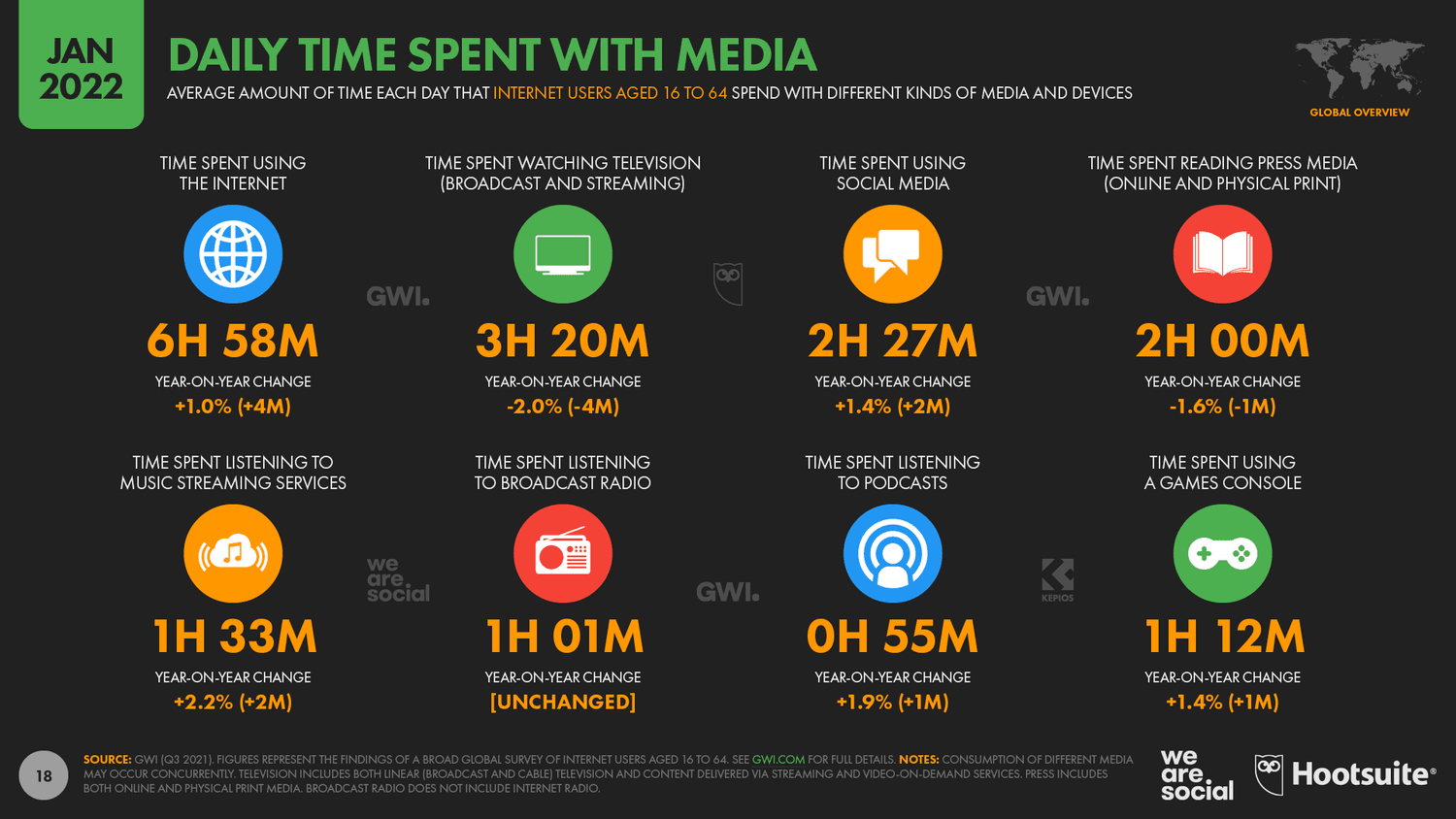 Research from GWI reveals that the “typical” global internet user now spends almost 7 hours per day – 6 hours and 58 minutes to be precise – using the internet across all devices.